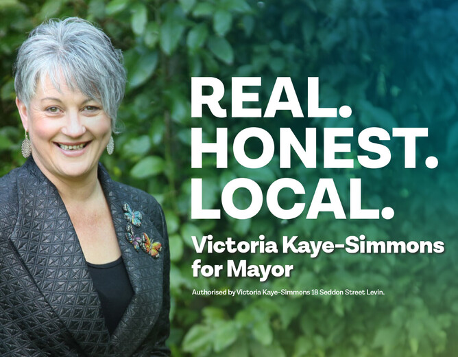 Victoria Kaye-Simmons is well known in the Horowhenua community for her positive attitude, her ability to work with others, be honest and genuine with people from all walks of life. She juggles multiple committee roles and supports a variety of organisations in the Horowhenua. Her campaign for the mayoralty was based on who she is, real, honest and local. Simplicity was key in what would be a sea of other hoardings (there was a record number of candidates for the Levin ward) so she needed to stand out from the crowd and look likes she means business. The result was a professional, warm and simple look to campaign on that absolutely fit the client and would relate to the people of the district.