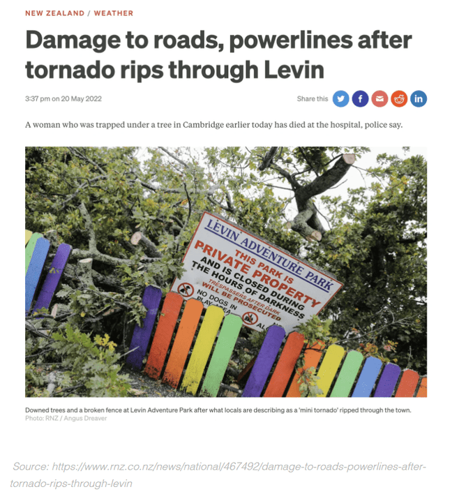 Levin was hit by a tornado around 6.30am on the 20th May damaging homes, downing power lines and ripping out trees. Drone footage from the Horowhenua District Council shows multiple houses without roofs, and one building completely decimated. The council said drone images showed 50 houses had been damaged. During the tornado a garden shed was flung across the street into a woman's house, which then smashed through the front window of the house.