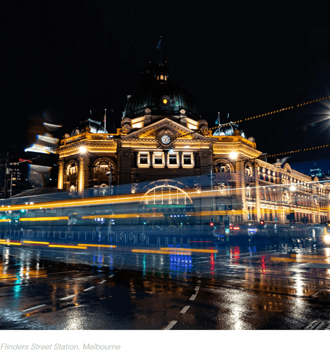 Night shoot at Flinders station – capturing movement – trams, lights, lines.