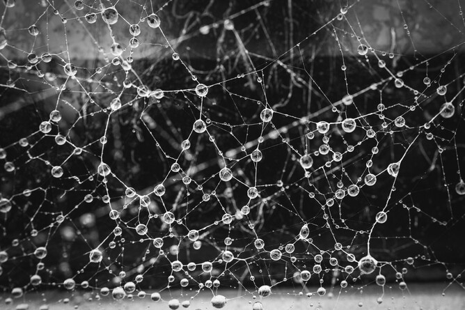 Here is a snap from the article of water drops on a rather elaborate web, you’d never know it was from the back windscreen wiper of a car!