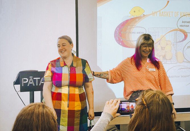 If you were paying attention, I chase the bits of my story that make my throat close up a bit with a sharp bit of humour. I wrap up cracking myself open with a dry quip. I presented my first speech in plaid rainbow and my second in full black.